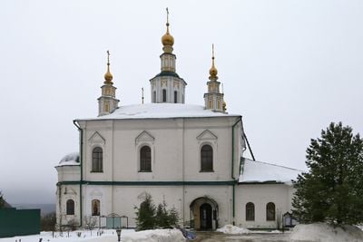 La chiesa in pietra presenta muri in calcare bianco con tre absidi, mostrando l'architettura ortodossa russa con un design a cupola singola.