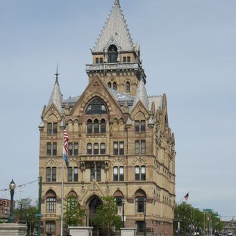 Il Syracuse Savings Bank Building presenta archi a sesto acuto, intagli ornamentali in pietra e una torre di 52 metri che domina North Salina.