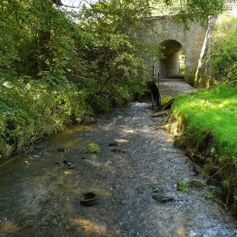 První železniční most přes Bělou v Bělé pod Bezdězem, kamenný obloukový most přes potok Bělá, zakrytý lávkou pro pěší
