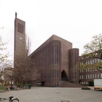 La Kirche am Hohenzollernplatz presenta una torre di 66 metri, facciate in mattoni clinker rosso-violacei e un caratteristico tetto in rame verde.