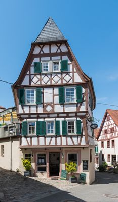House Kintlein, half-timbered house on the corner of Bogengasse, high basement with old shop fittings, windows with profiled sandstone walls in Heppenheim, Bergstrasse district, Hesse