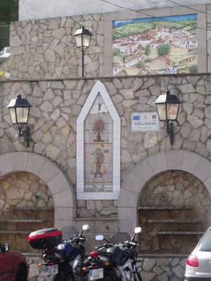 Retablo cerámico de la Virgen de los Desamparados y florero
