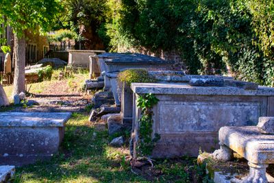 Row Of 10 Chest Tombs And One Table Tomb Against The South East Of Churchyard Wall Of The Church Of St John The Baptist, chest tomb in Bishopsteignton, Teignbridge, Devon, UK