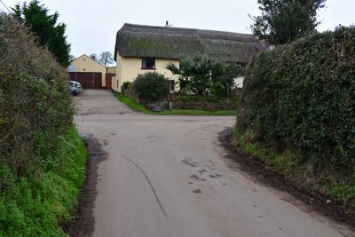 Milestone, opp. Huxham Wood Farm entrance (cattery), 300m NW of Pynes Lodge, opp. top N end of Huxham Bridge