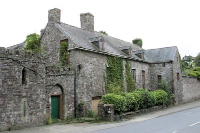 Island House presenta spesse mura in pietra, due finestre a bovindo e un ingresso merlato, estendendosi lungo Wogan Street sotto il Castello di Laugharne.