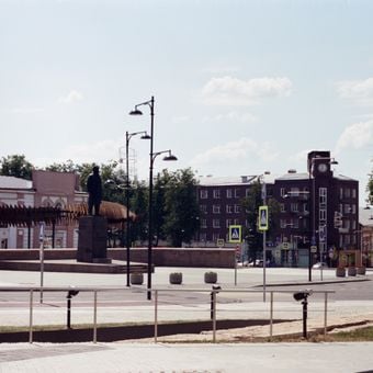 Piazza Lenin presenta ampi spazi aperti, sentieri in pietra ed elementi architettonici sovietici che formano lo spazio pubblico centrale di Serpukhov.