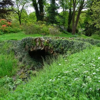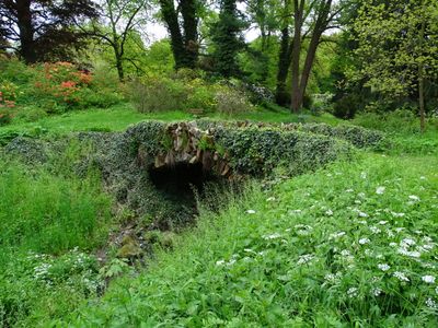 Mostek přes Janovický potok severovýchodně od zámku Vrchotovy Janovice, kamenný klenutý mostek v zámeckém parku