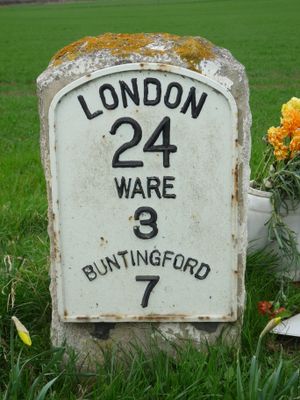 Milestone, S of Tonwell beside footpath on track of old road E of A602