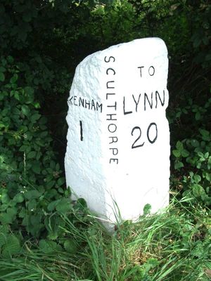 Milestone, 20yds W of jct with A148, milestone in Sculthorpe, North Norfolk, UK