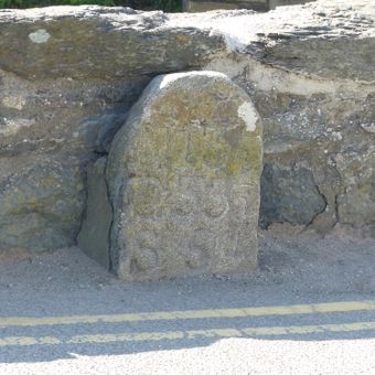Milestone on Pont Fach, Grade II listed milestone in Aberdaron, Gwynedd. Situated on left end of S parapet of Pont Fach in Aberdaron village