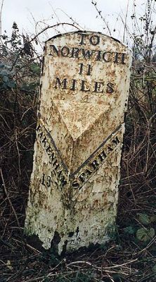 Milepost, 140yds E of turning to Wildlife Park, milepost in Sparham, Breckland, UK