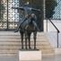 La scultura in bronzo presenta un cavallo e un cavaliere con braccia distese, posizionata lungo il Canal Grande nel sestiere di Dorsoduro.