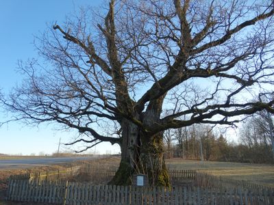Questa quercia lituana raggiunge un diametro notevole di 7,7 metri, rendendola la terza quercia più grande del paese.