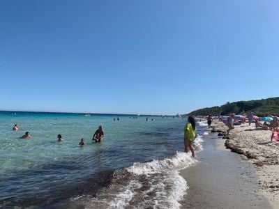 La spiaggia mantiene il suo stato naturale senza strutture commerciali, offrendo una vista libera sul Golfo di Saint-Tropez.
