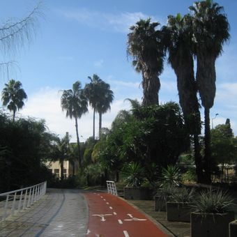 Il giardino presenta diverse sezioni con palme, cactus, piante tropicali, vasche quadrate, cascate e una passeggiata fluviale in legno lungo il Guadalquivir.
