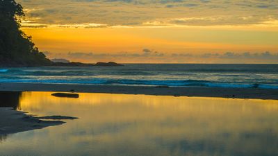 Il fiume Itamambuca crea una piscina naturale alla sua foce durante la bassa marea, formando una zona protetta per nuotare di fronte alle montagne.