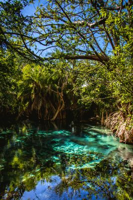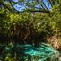 Le acque blu cristalline di Kikuletwa scorrono a una temperatura di 27°C, circondate da palme e radici di fichi.