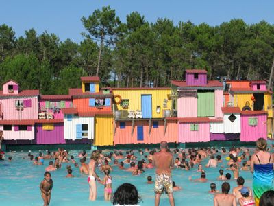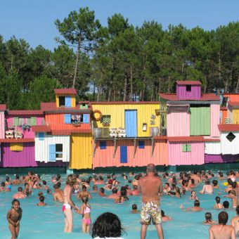 Aqualand Bassin d'Arcachon si estende su sei ettari di terreno boscoso, con numerosi scivoli d'acqua, piscine e spiagge bordate di palme.