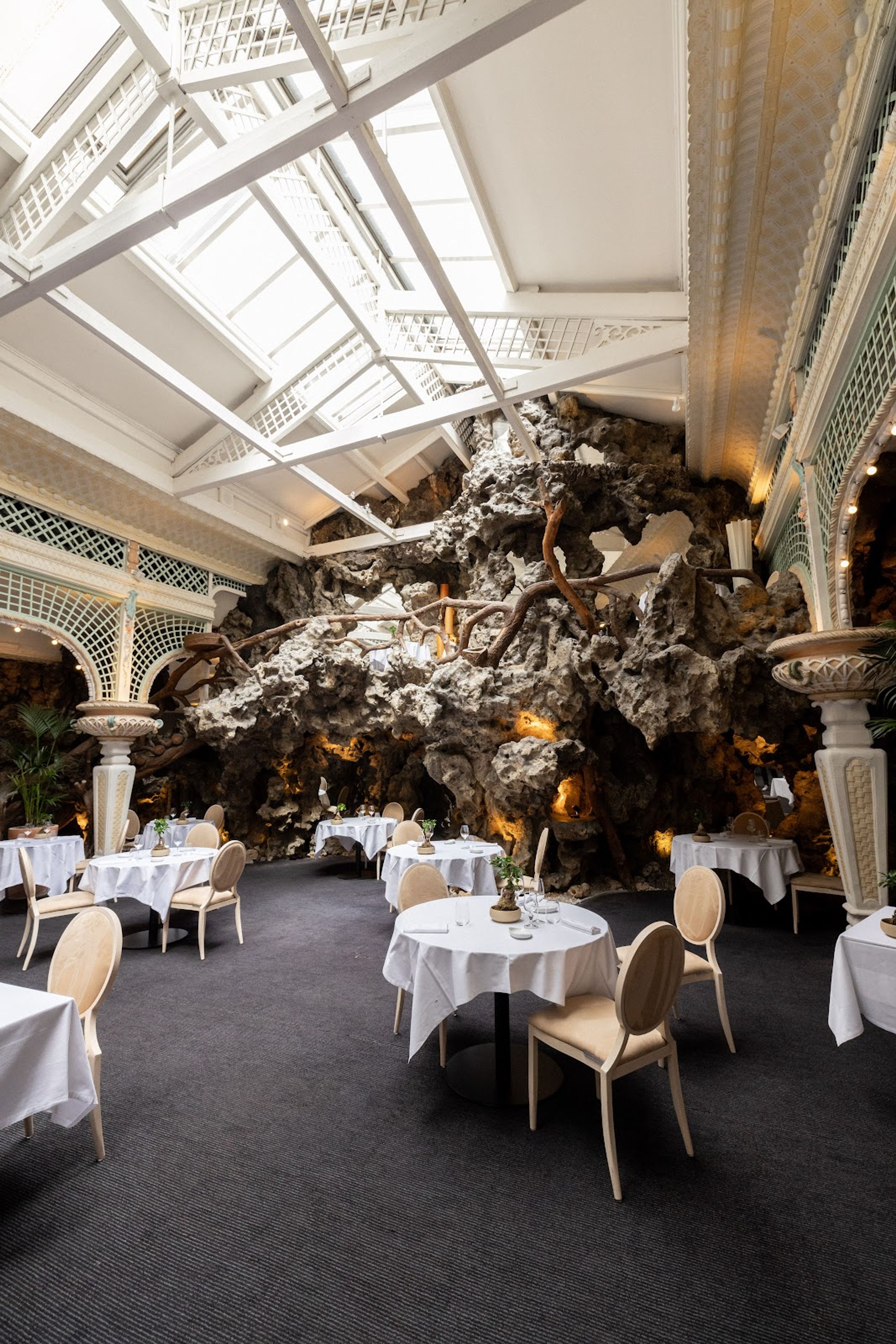 Le Chapon Fin offre cucina francese moderna in una sala decorata con formazioni rocciose artificiali ed elementi Art Deco dal 1901.