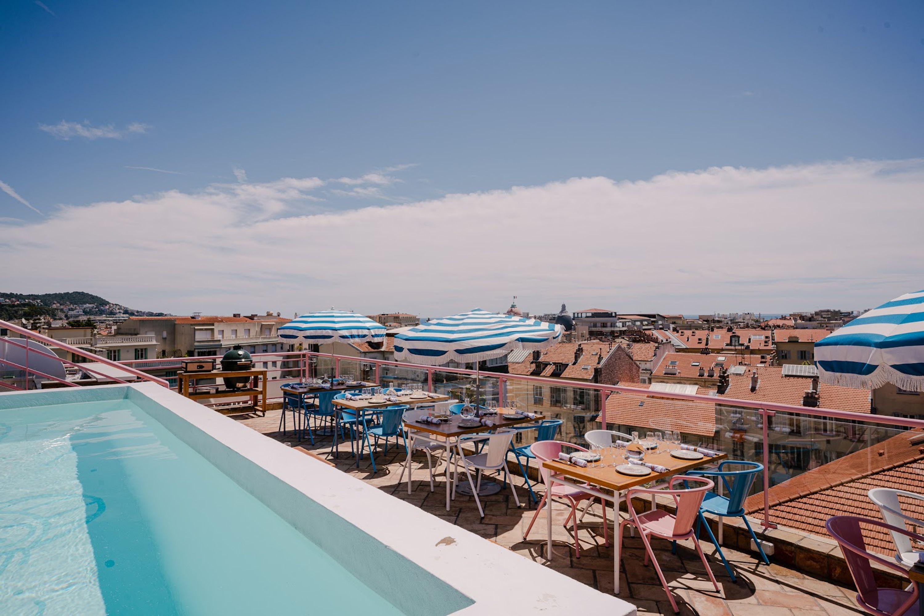 Le camere escludono televisori e telefoni, presentando bagni in marmo rosa e balconi che enfatizzano il legame con la Riviera Francese.