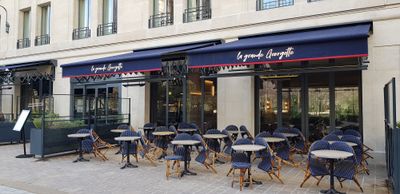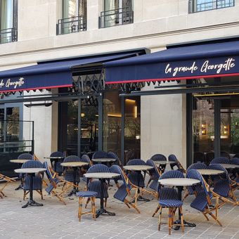 Il ristorante La Grande Georgette incorpora elementi di design industriale con colori blu e rosso, rendendo omaggio al patrimonio dei pompieri francesi.
