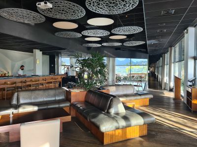 La disposizione della sala crea piattaforme individuali per ogni tavolo, offrendo agli ospiti una prospettiva elevata dello spazio.