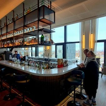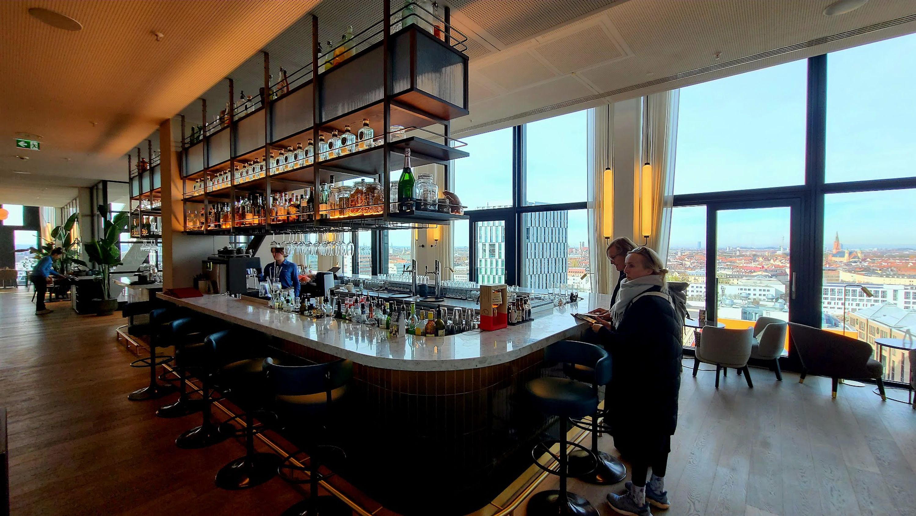 Questo locale gastronomico elevato occupa il 14° e 15° piano dell'edificio WERK4, con finestre panoramiche che offrono viste estese sul paesaggio urbano di Monaco fino alle montagne alpine.