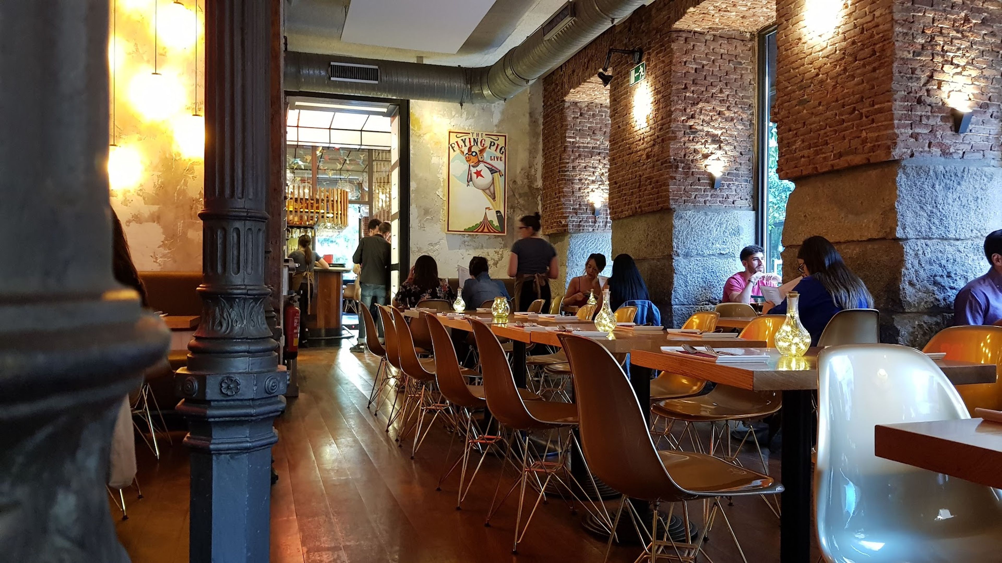 Il ristorante occupa un angolo sulla Calle de Manuela Malasaña, con pareti in mattoni a vista decorate con uccelli origami e sfere luminose.