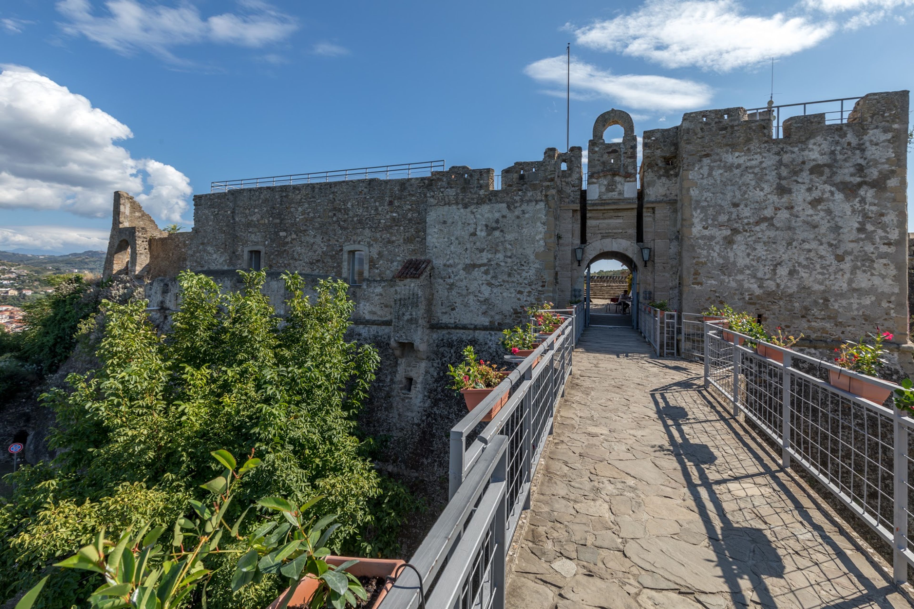Il castello sorge su una collina costiera con mura di pietra, torri e strutture difensive che dominano il Mar Tirreno.
