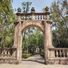 Il giardino presenta archi in pietra, una balaustra in pietra rosa e un tempio monoptero circondato da sentieri e aree verdi.