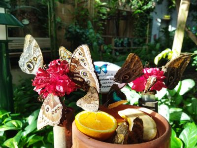 L'edificio presenta un ambiente tropicale dove 200 farfalle di 35 specie volano liberamente tra i visitatori nei giardini interni.