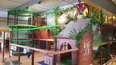 Il parco giochi interno si estende su 1000 metri quadrati e include nove tappeti elastici, torri per arrampicata, scivoli e go-kart in miniatura.