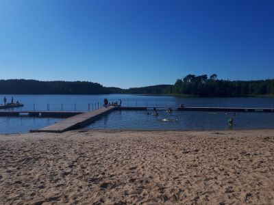 La spiaggia presenta un ampio litorale sabbioso lungo il lago Mierzyńskie con passerelle in legno, rampe e scale verso l'acqua.