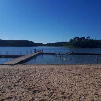 La spiaggia include punti di osservazione che offrono viste sul lago Mierzyńskie e sul paesaggio circostante del Bacino di Gorzów.