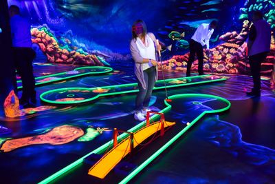La struttura di 800 metri quadrati presenta 18 buche distribuite in sei zone tematiche, decorate con vernice fluorescente e luci nere.