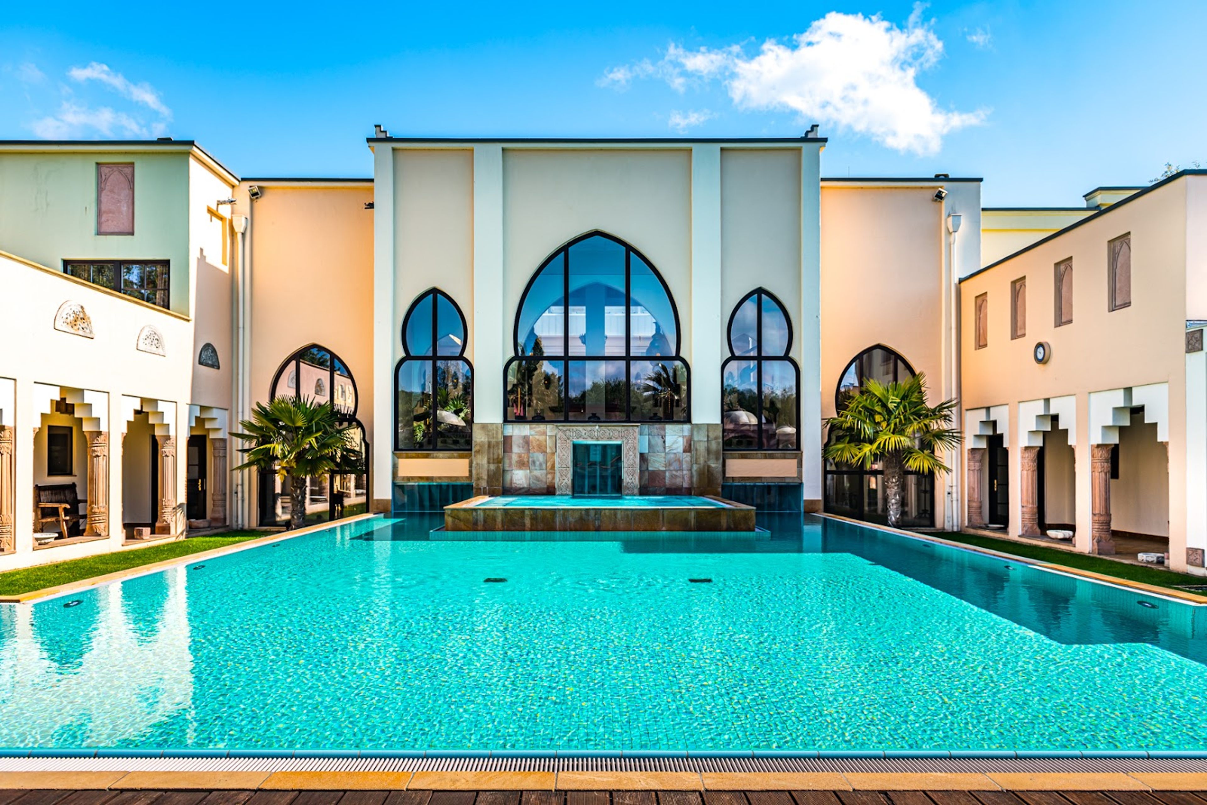 Il complesso Mediterana si estende su 18.000 metri quadrati con 15 zone sauna, 6 piscine interne ed esterne, e numerose sale per trattamenti.