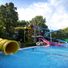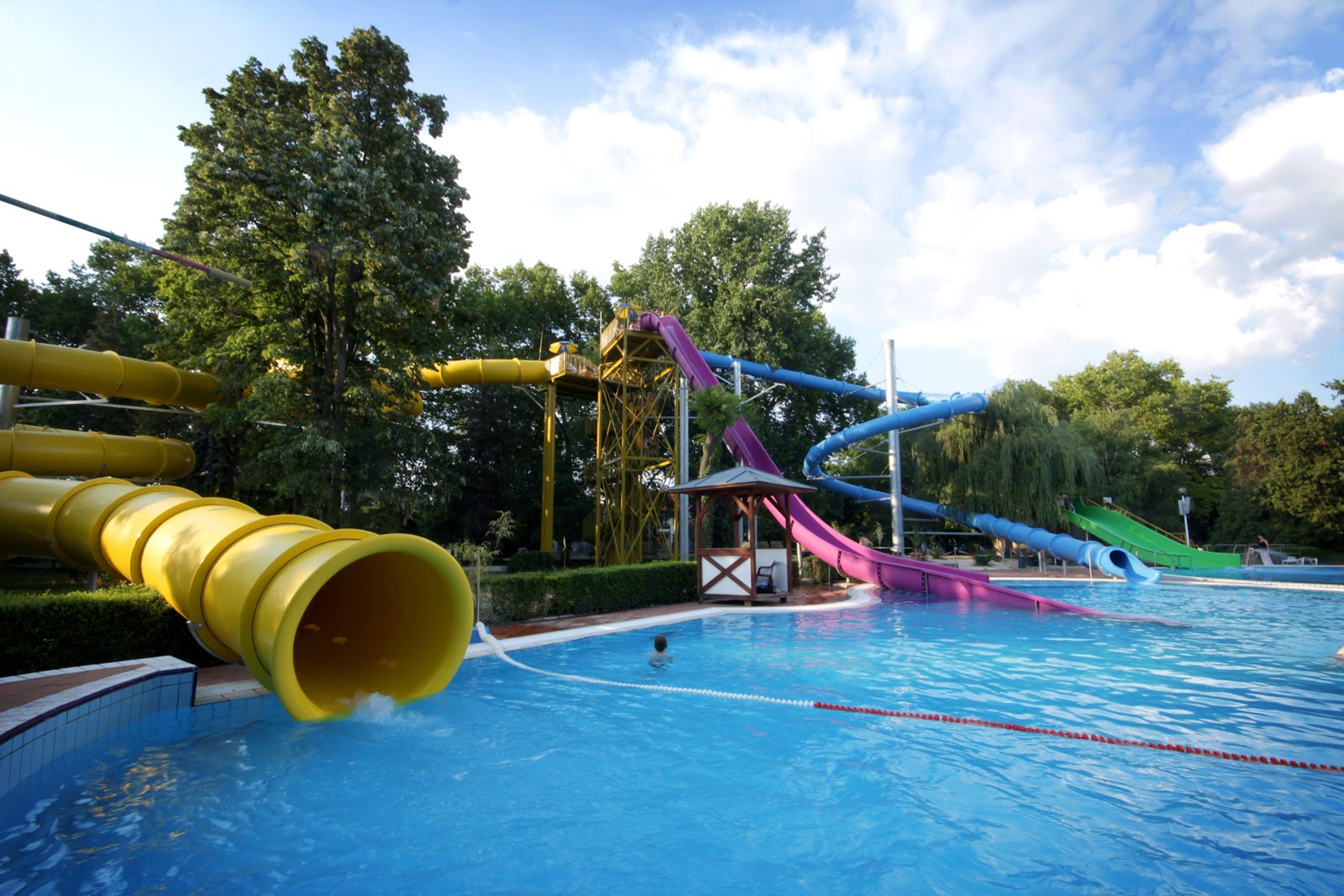 La struttura si estende lungo il Danubio con diverse piscine, aree per il nuoto e scivoli distribuiti su terreni paesaggistici con alberi.