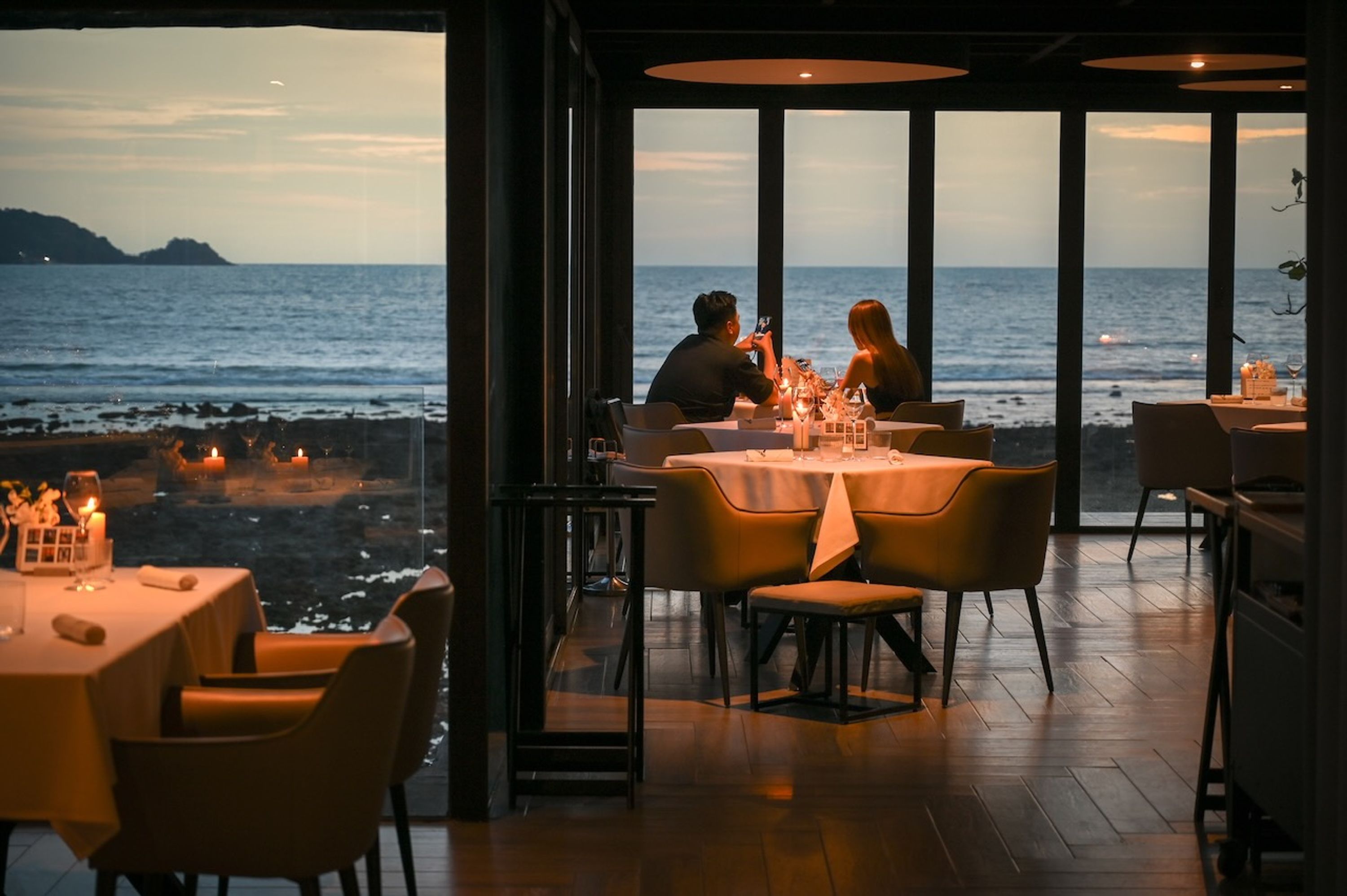 L'Arôme by the Sea offre cucina francese contemporanea in un ambiente elegante di fronte alla baia di Kalim, con sala da pranzo interna e terrazza esterna con vista panoramica sul mare delle Andamane.