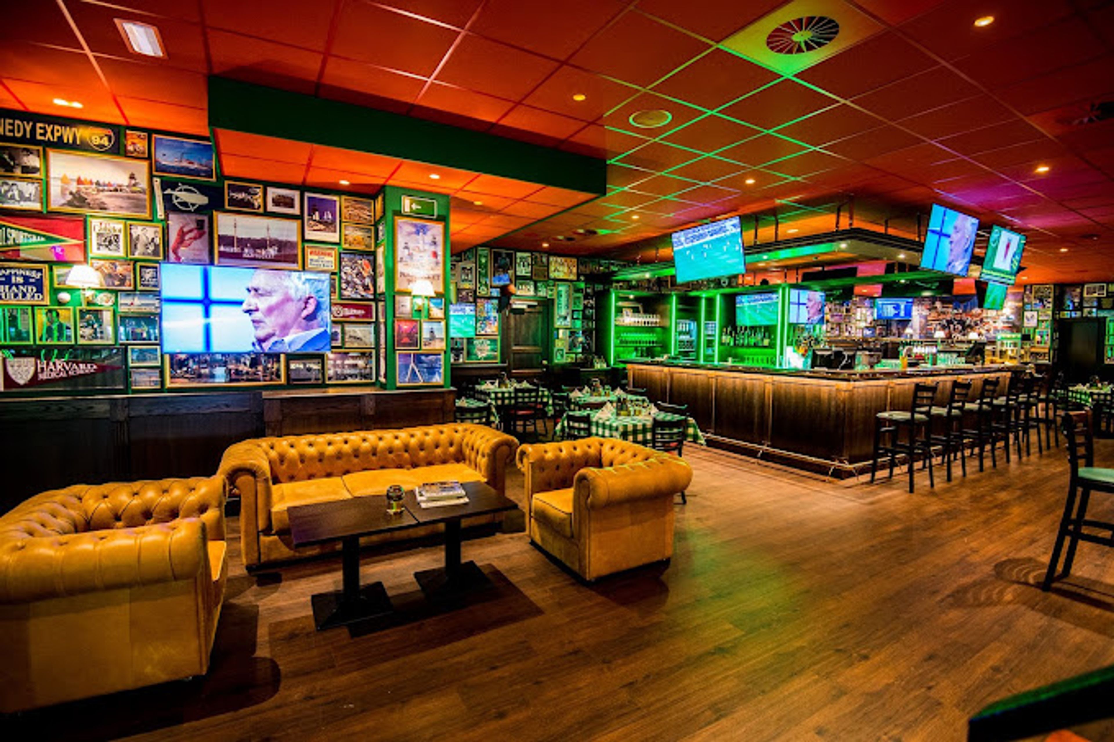 Gli interni del ristorante ricreano l'atmosfera di un bar sportivo di Boston, con elementi decorativi e schermi per eventi sportivi internazionali.
