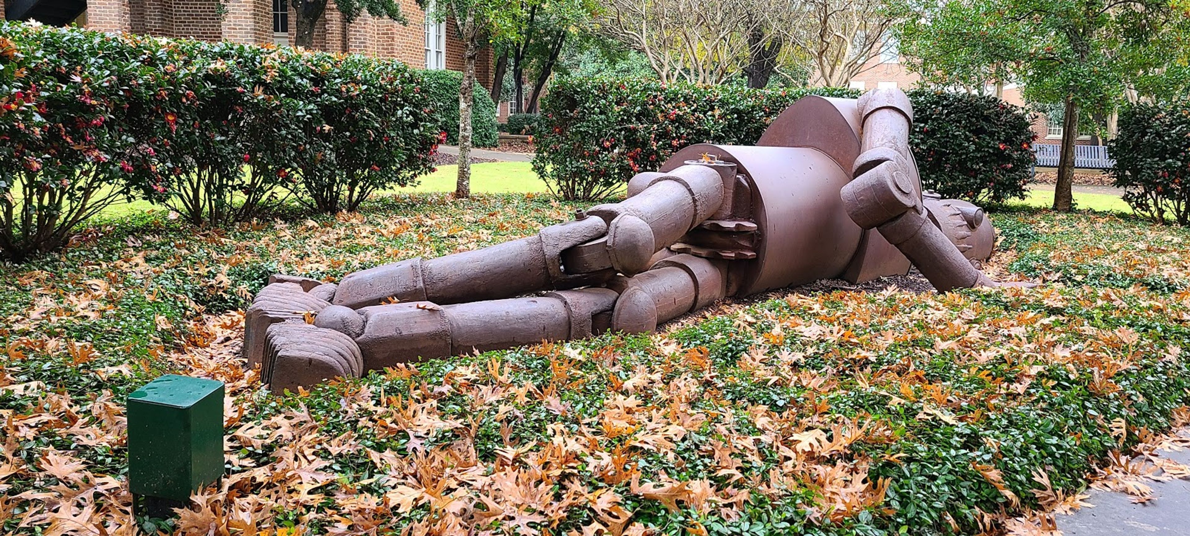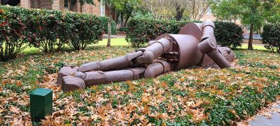 La scultura in ferro misura 7 metri e pesa tre tonnellate, raffigurando un robot disteso nel giardino delle sculture dell'università.