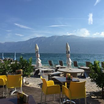 La riva coperta di pietre del Lido dei Limoni si estende lungo il bordo occidentale del Lago di Garda, offrendo viste sulle cime montuose.