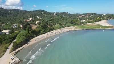 La spiaggia si estende lungo la costa settentrionale di Corfù tra Roda e Sidari, con sabbia grossa marrone mescolata a ciottoli sparsi.