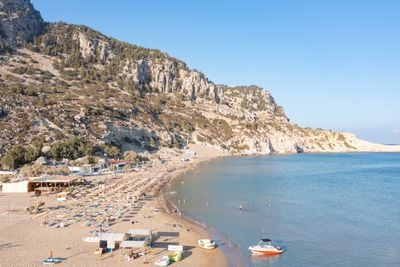 Gli 800 metri di sabbia dorata della spiaggia di Tsampika digradano dolcemente verso le acque mediterranee sulla costa orientale di Rodi.
