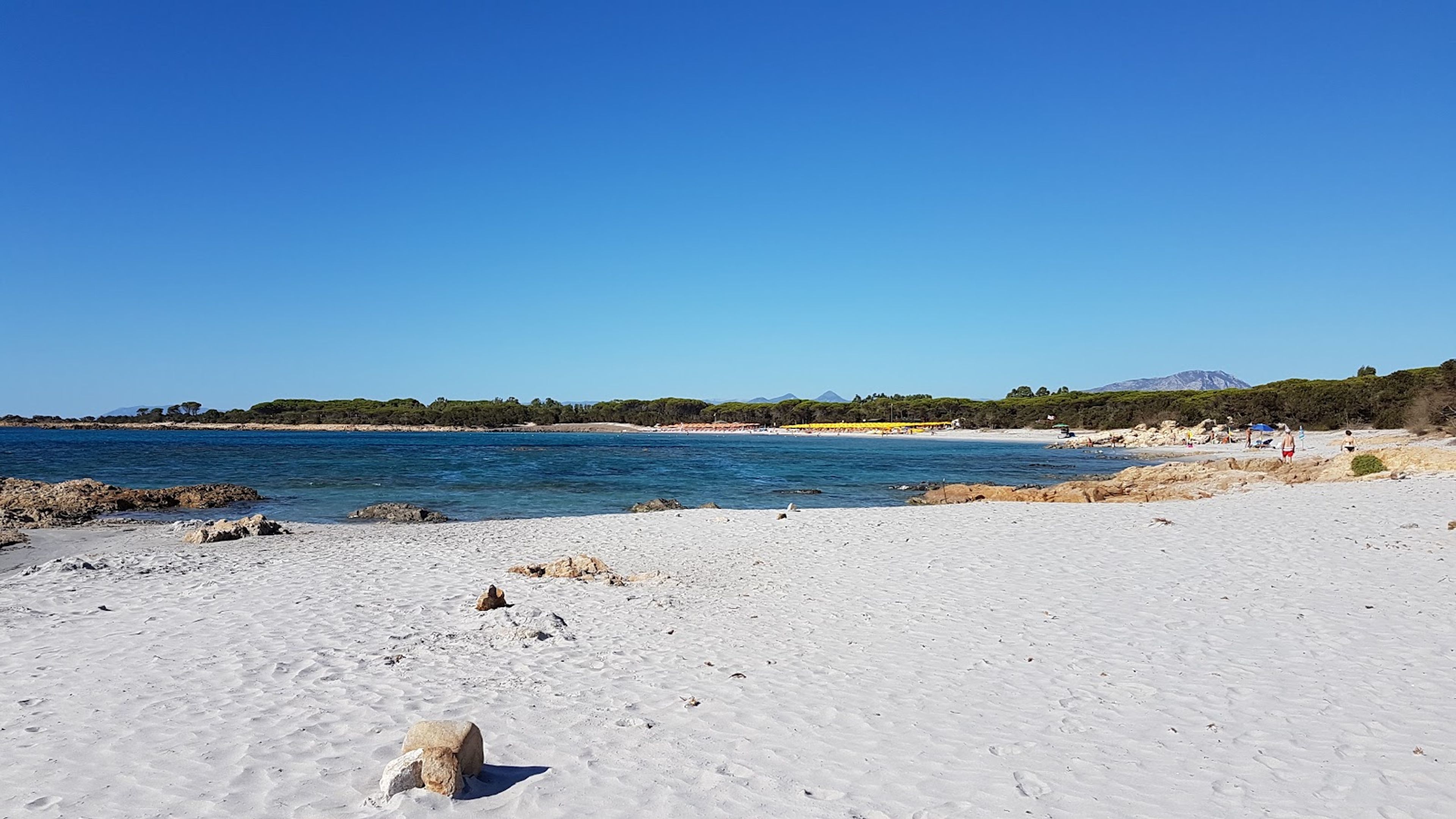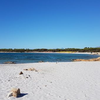Il tratto di 500 metri di sabbia bianca incontra acque turchesi, incorniciato da fitte pinete e vegetazione mediterranea lungo la costa orientale sarda.