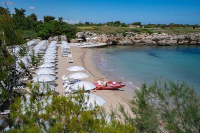 Famiglie locali e visitatori si riuniscono in questa spiaggia per vivere la vita costiera tradizionale pugliese gustando pesce fresco.
