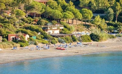 La spiaggia unisce due texture distinte con ciottoli fini e zone sabbiose, mentre una pineta privata crea uno sfondo naturale.