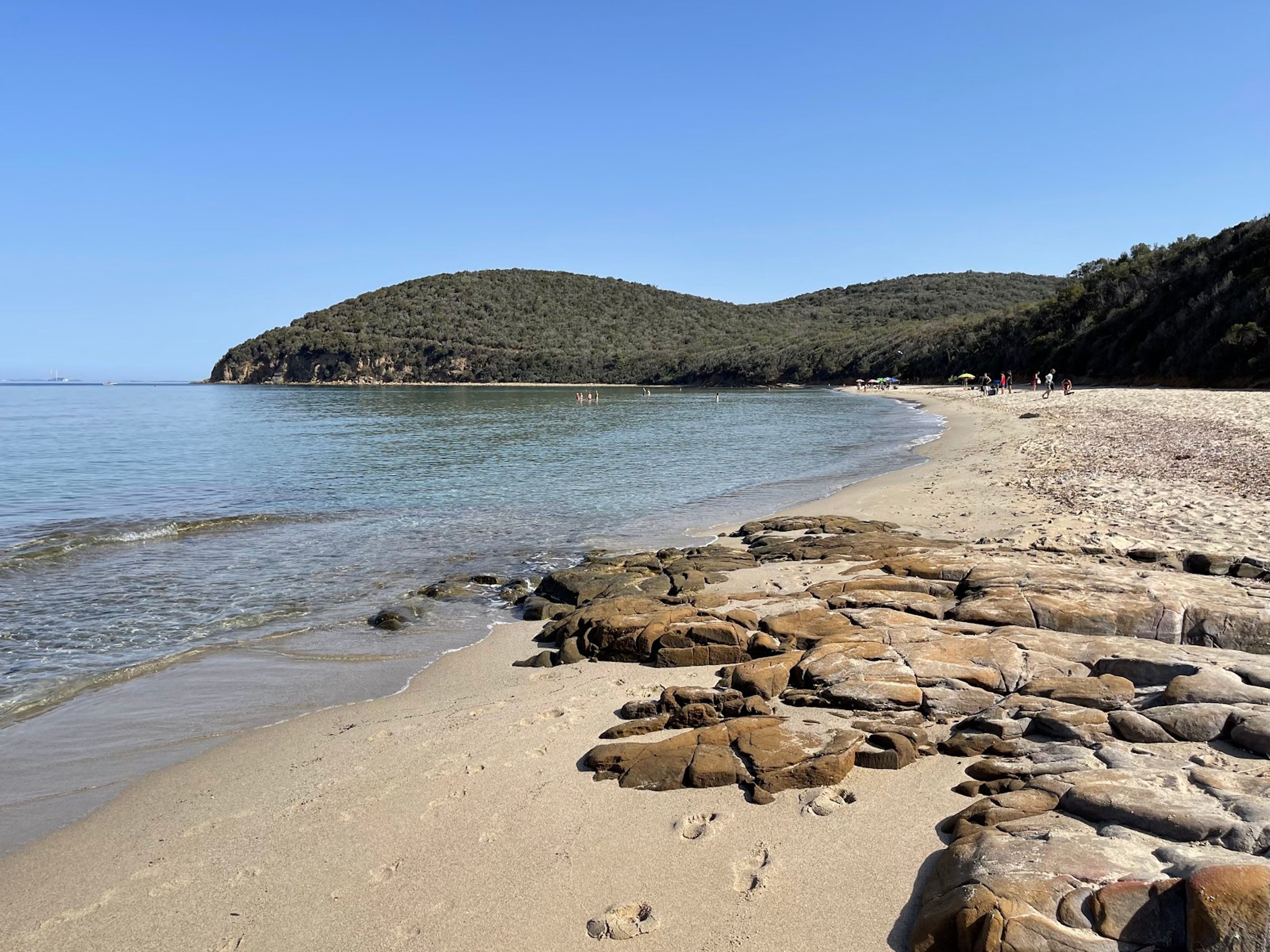 La spiaggia di sabbia bianca si estende nella Riserva Naturale delle Bandite di Scarlino, incorniciata da due promontori e vegetazione mediterranea.