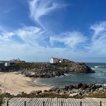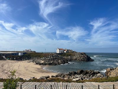 La spiaggia si estende lungo la costa atlantica con aree sabbiose di media dimensione e onde regolari adatte alle attività acquatiche.