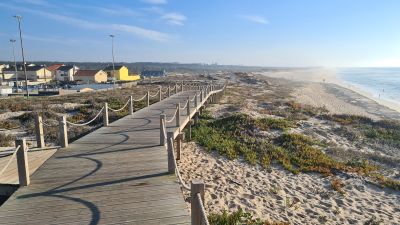 La spiaggia si estende per 5,8 chilometri lungo la costa portoghese, con una combinazione di litorali sabbiosi e un molo centrale.