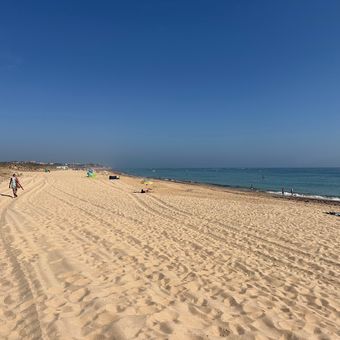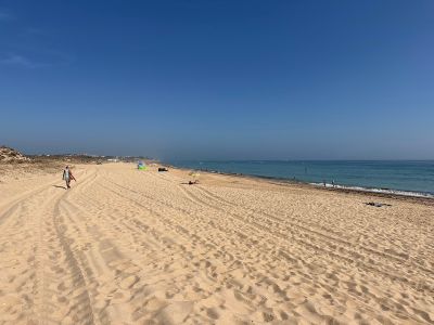 La spiaggia si estende per oltre 2 chilometri lungo la costa atlantica, con dune naturali e zone umide collegate da passerelle in legno.